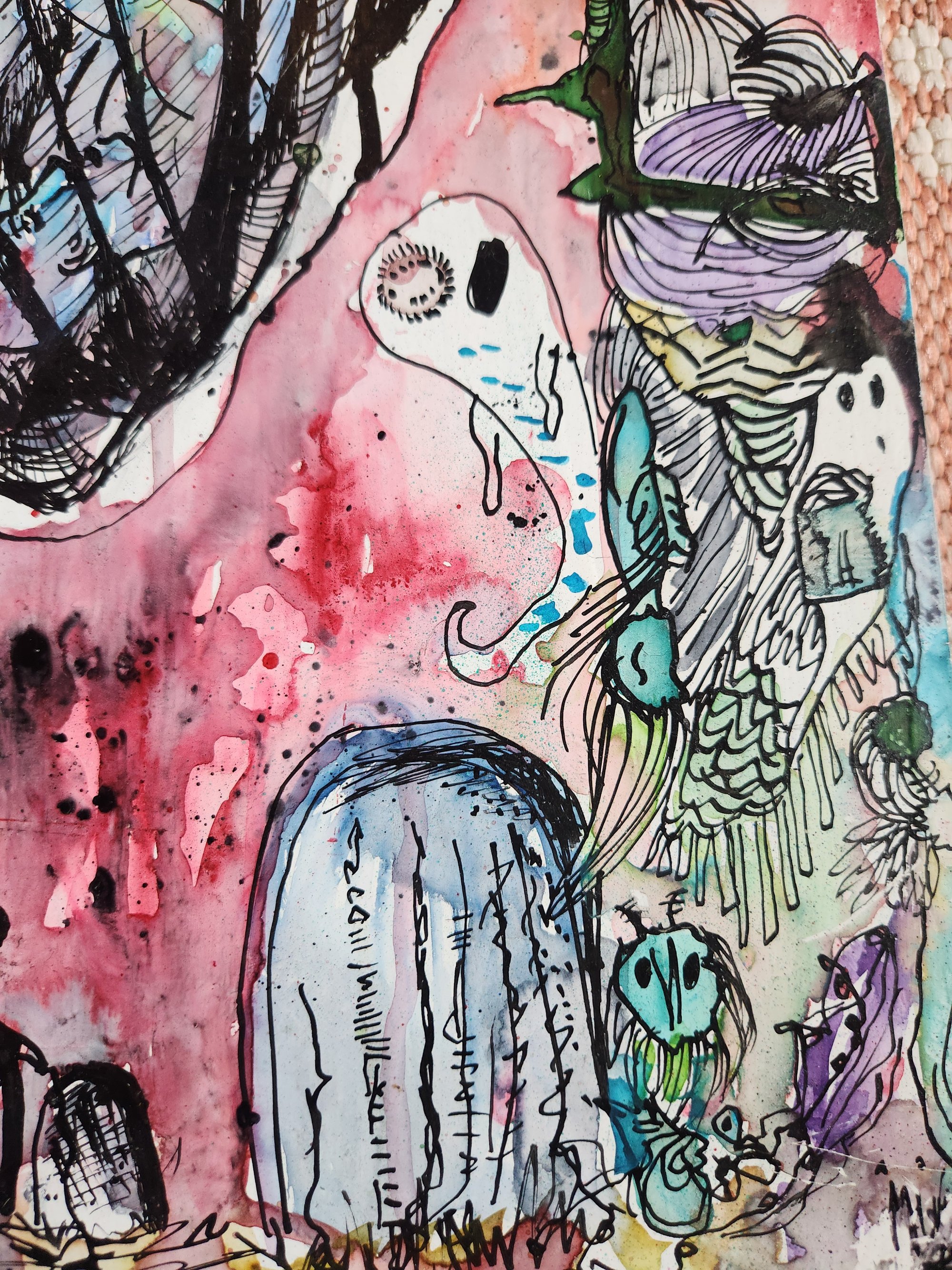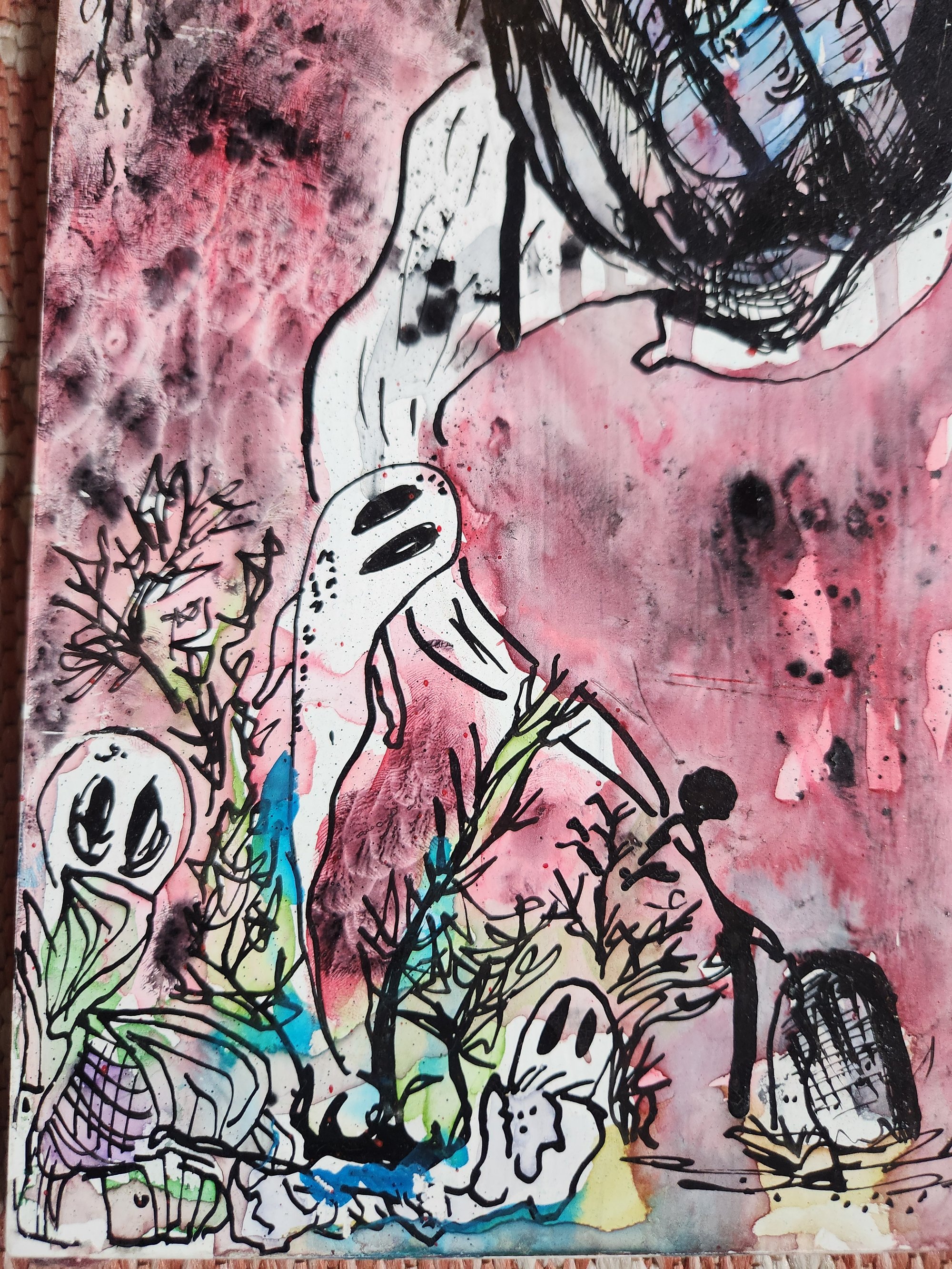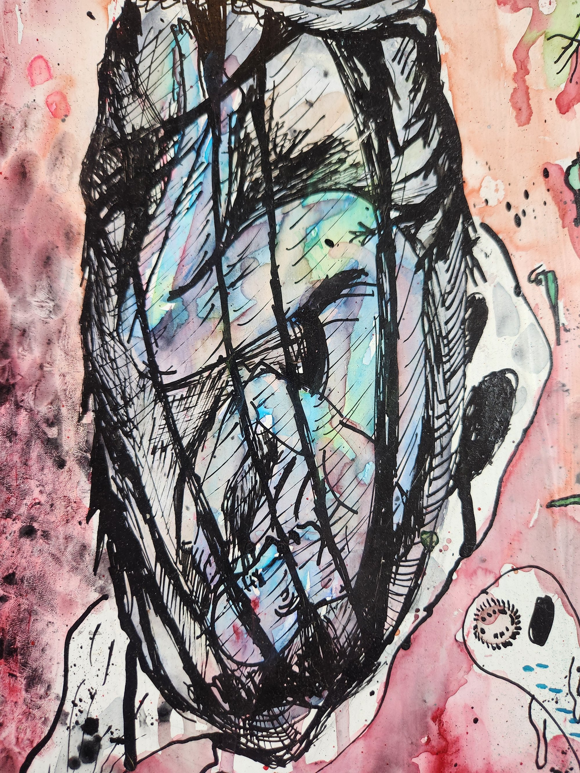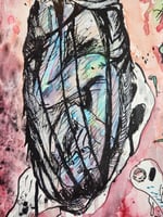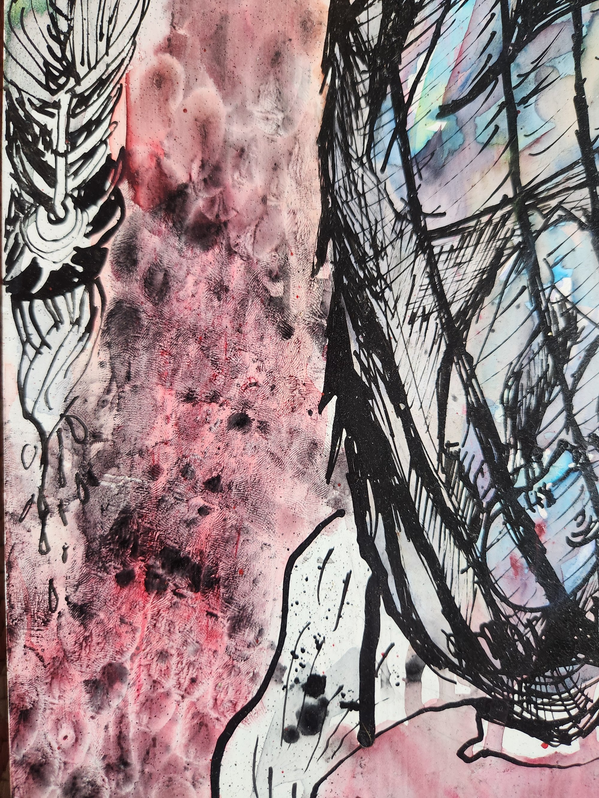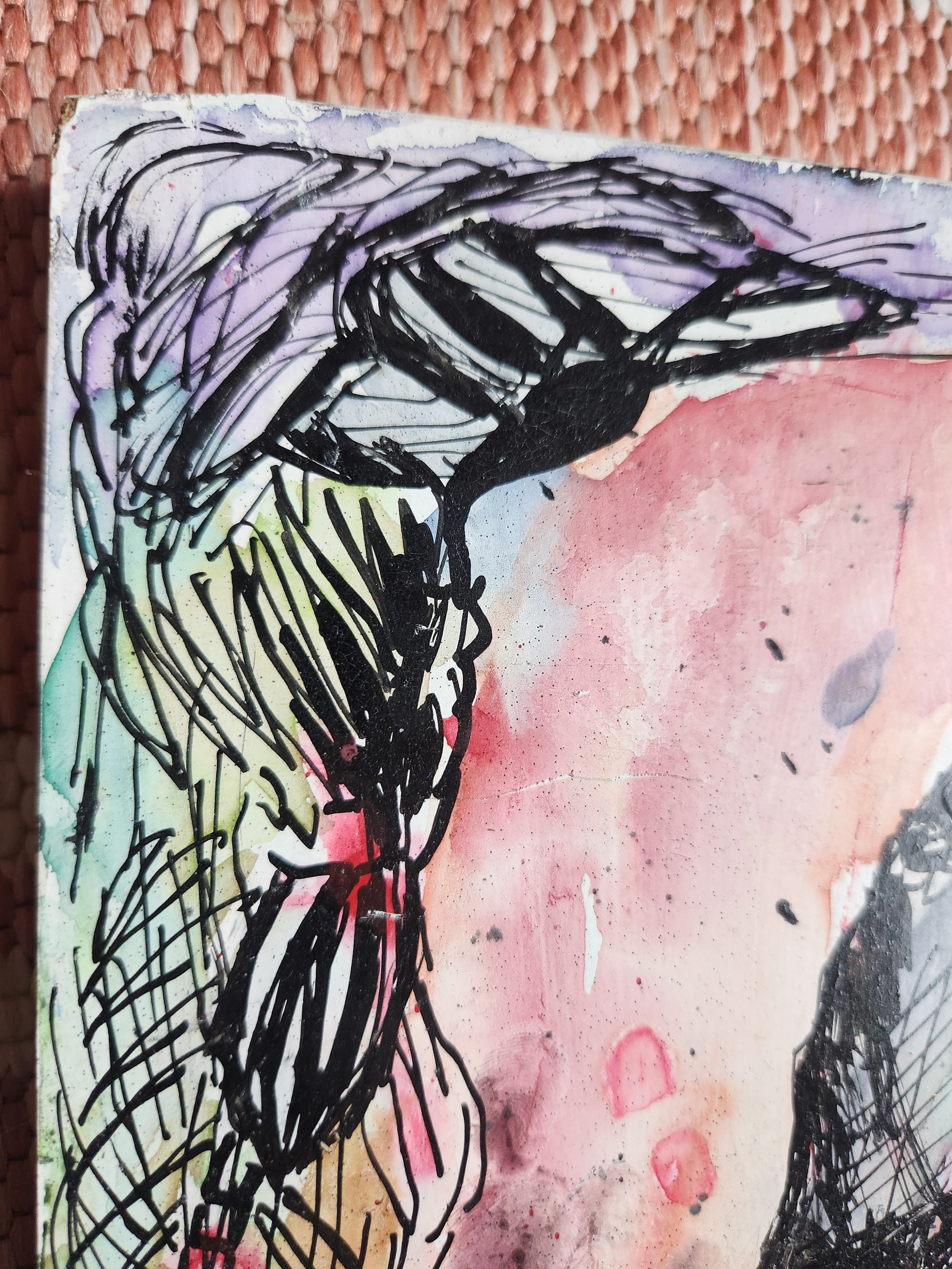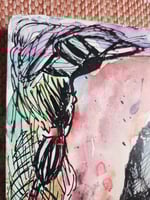 18x11.5 watercolor and indian ink on reclaimed distressed wood of cocooned figure with ghosts swirling about.
