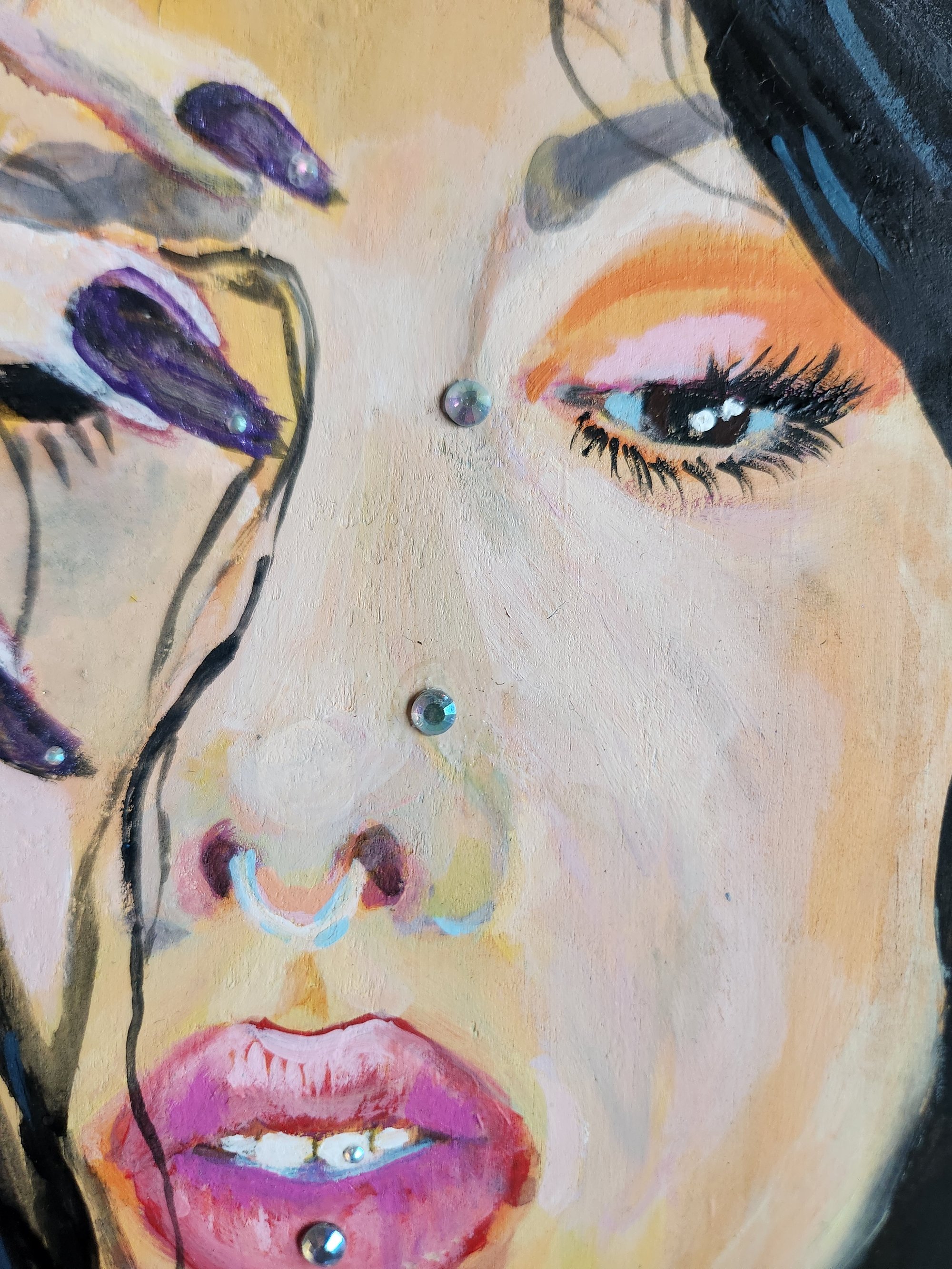 11x9" Acrylic and mix media on wood of sassy female with tooth gems and piercings.