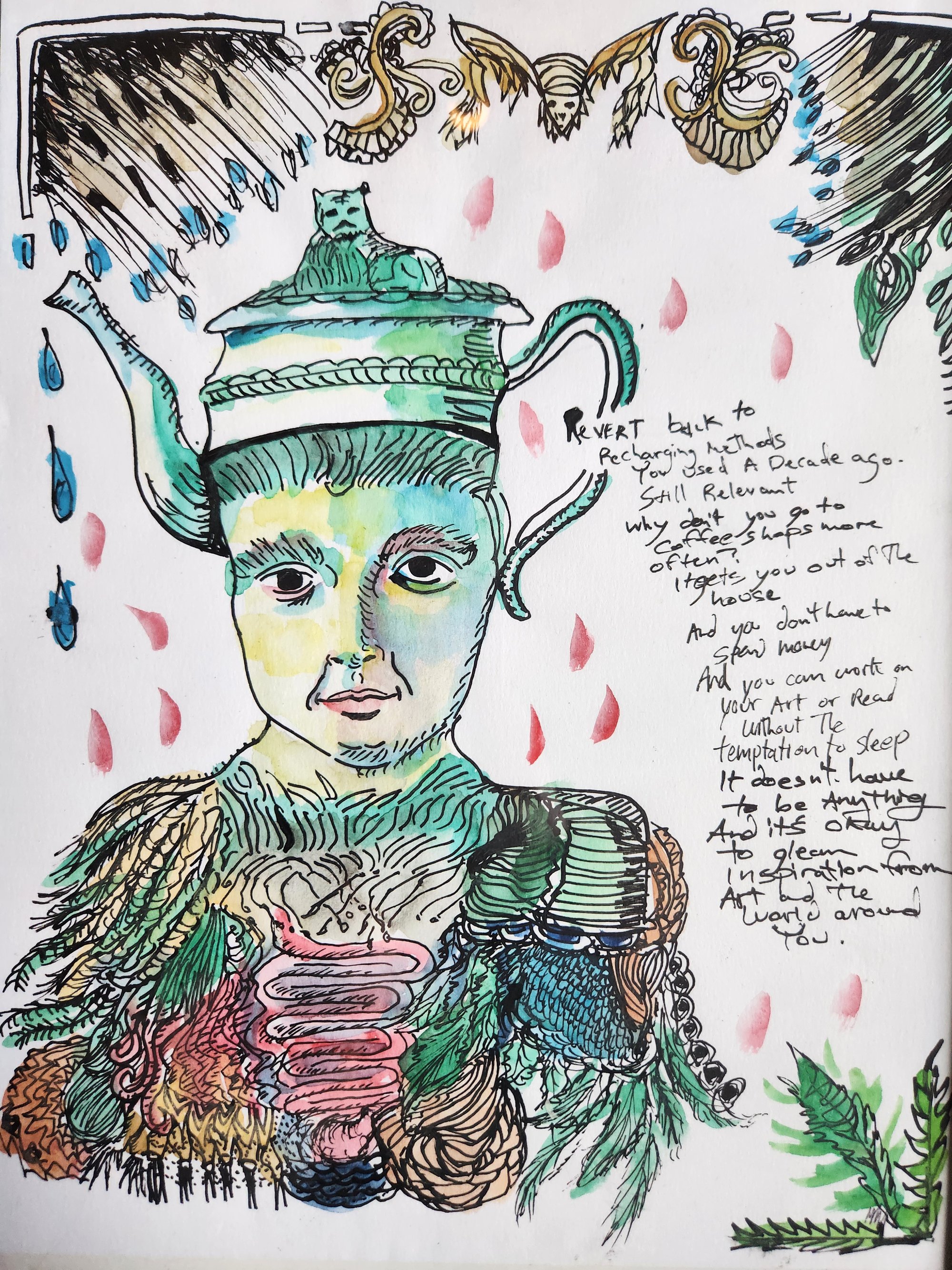 "Side effects may include teapot head" painting
